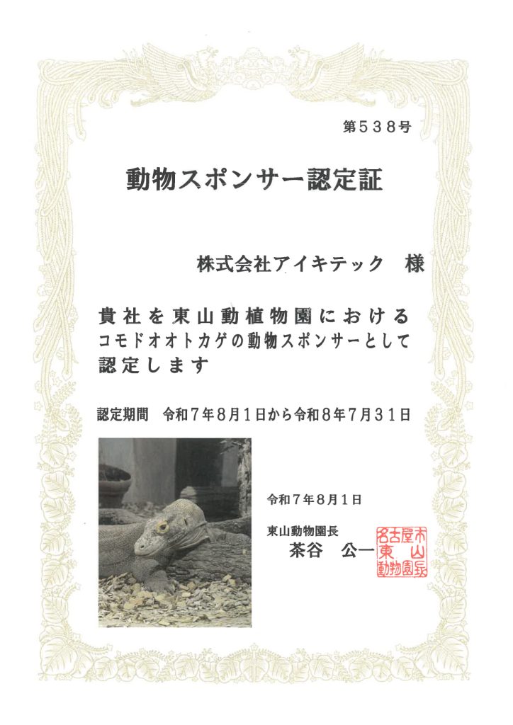 We have become an animal sponsor of the Komodo dragon at Higashiyama Zoo and Botanical Gardens.