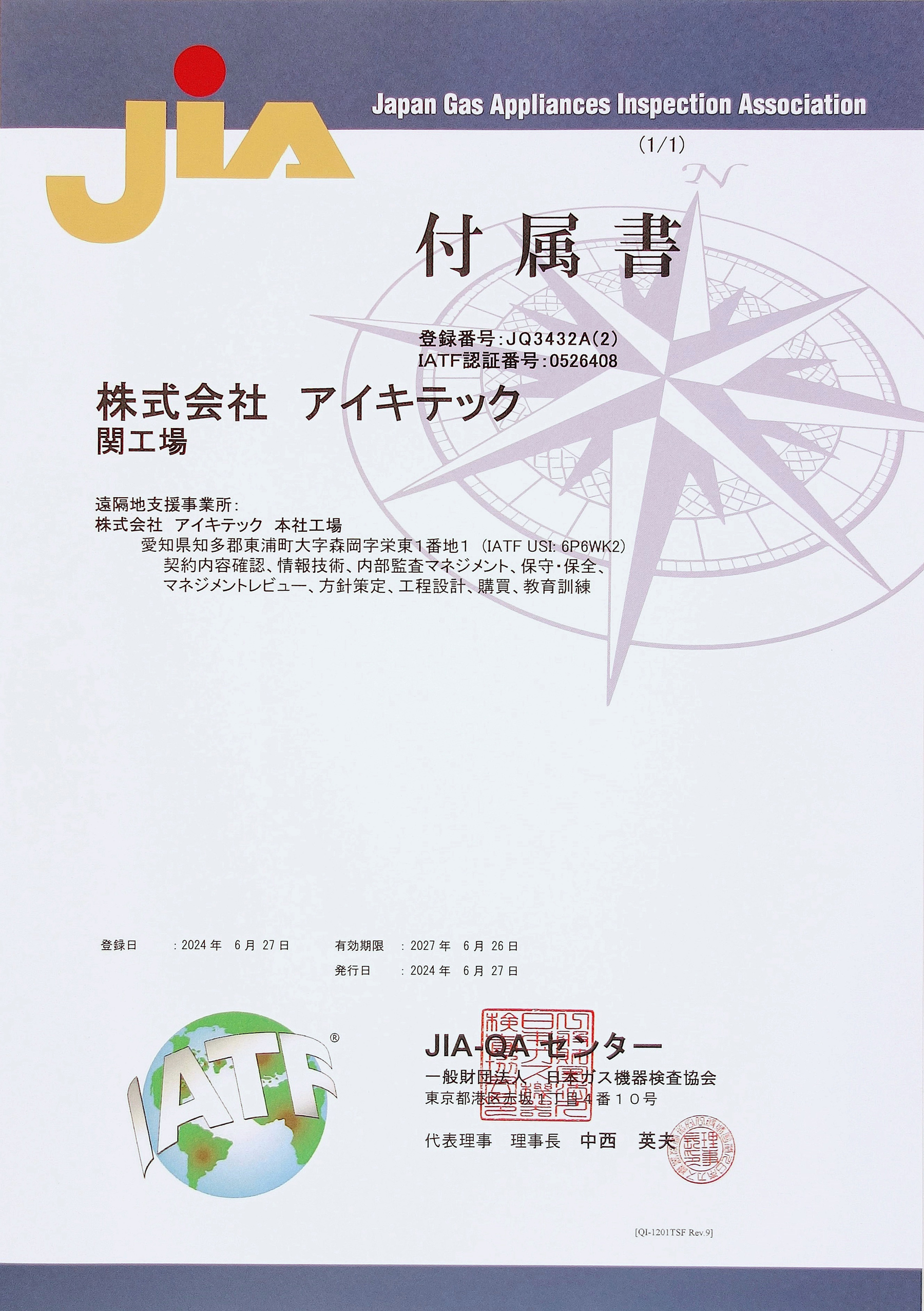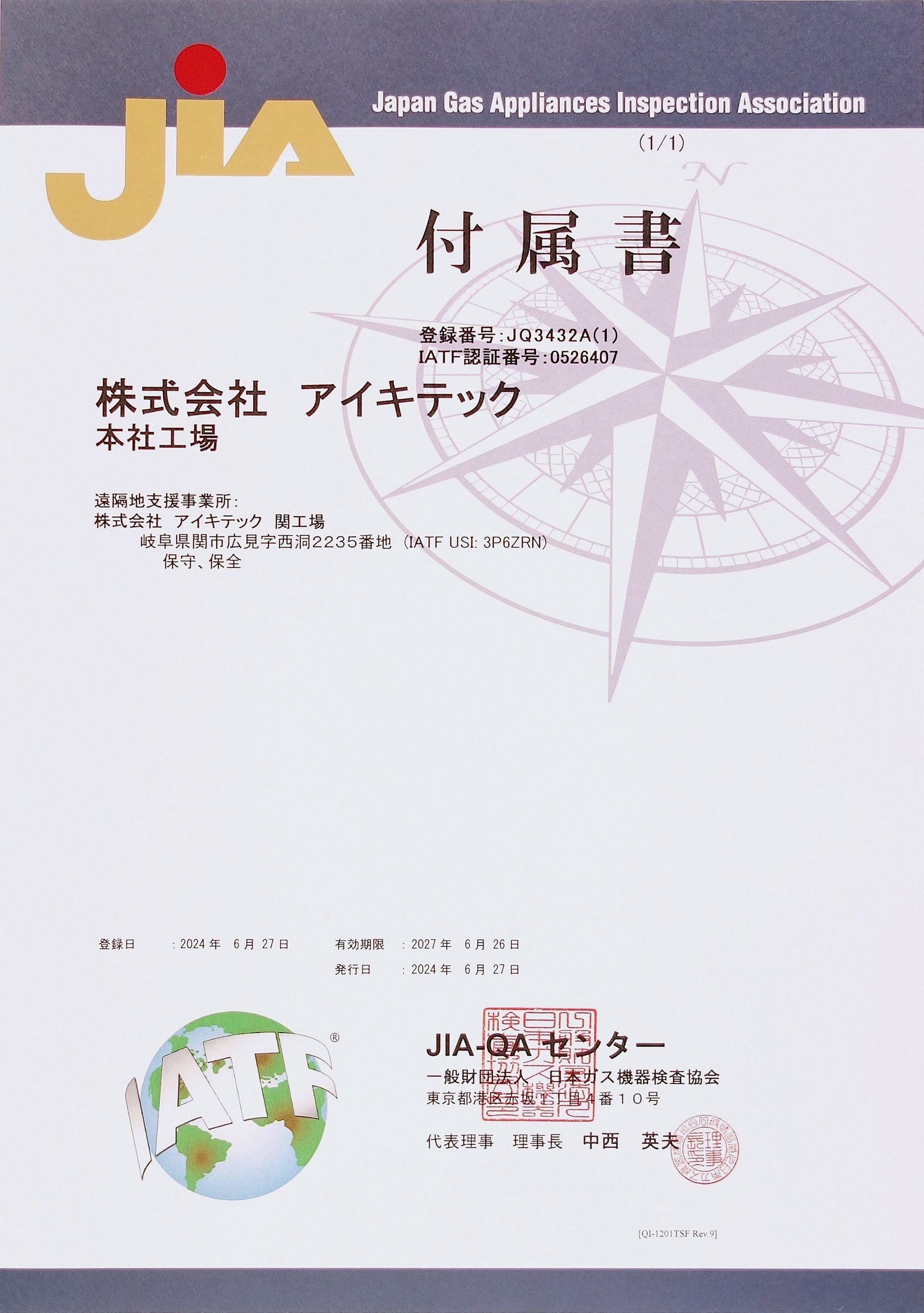 Certification Body: Japan Gas Appliances Inspection Association, JIA-QA Center