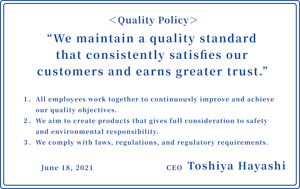 We implement process design and management based on the fundamental quality principle of achieving a 100% yield rate.