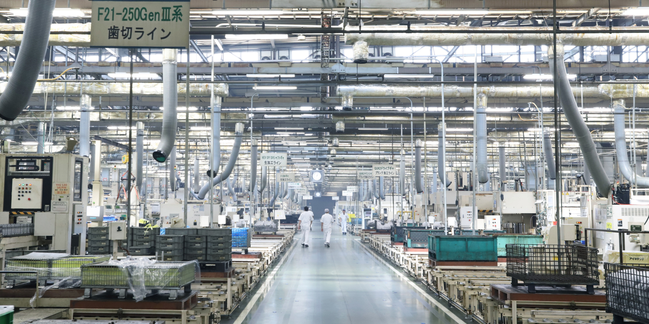 当社のミッション部品・ギヤは、この現場で熟練スタッフの手によって生産されています。製造ラインの迫力と、ものづくりへの強いこだわりを感じていただけるエリアです。
