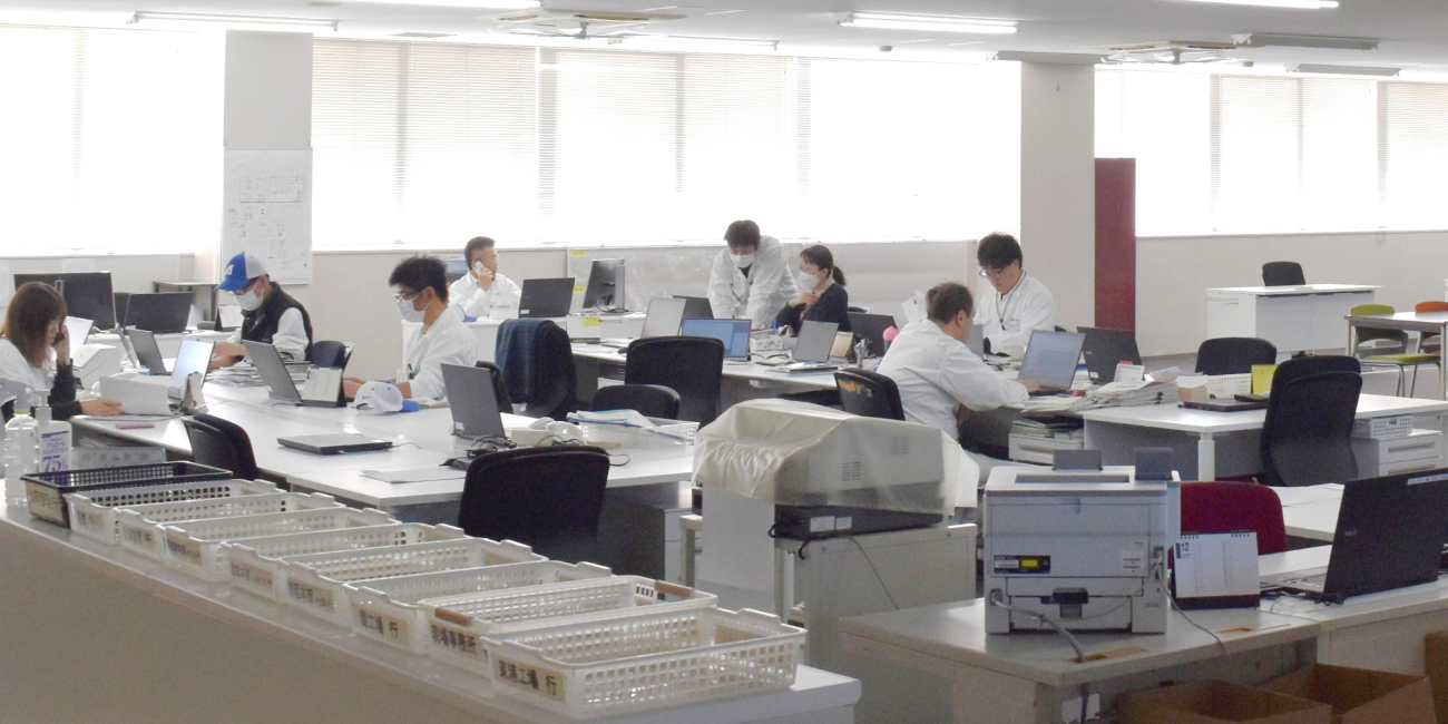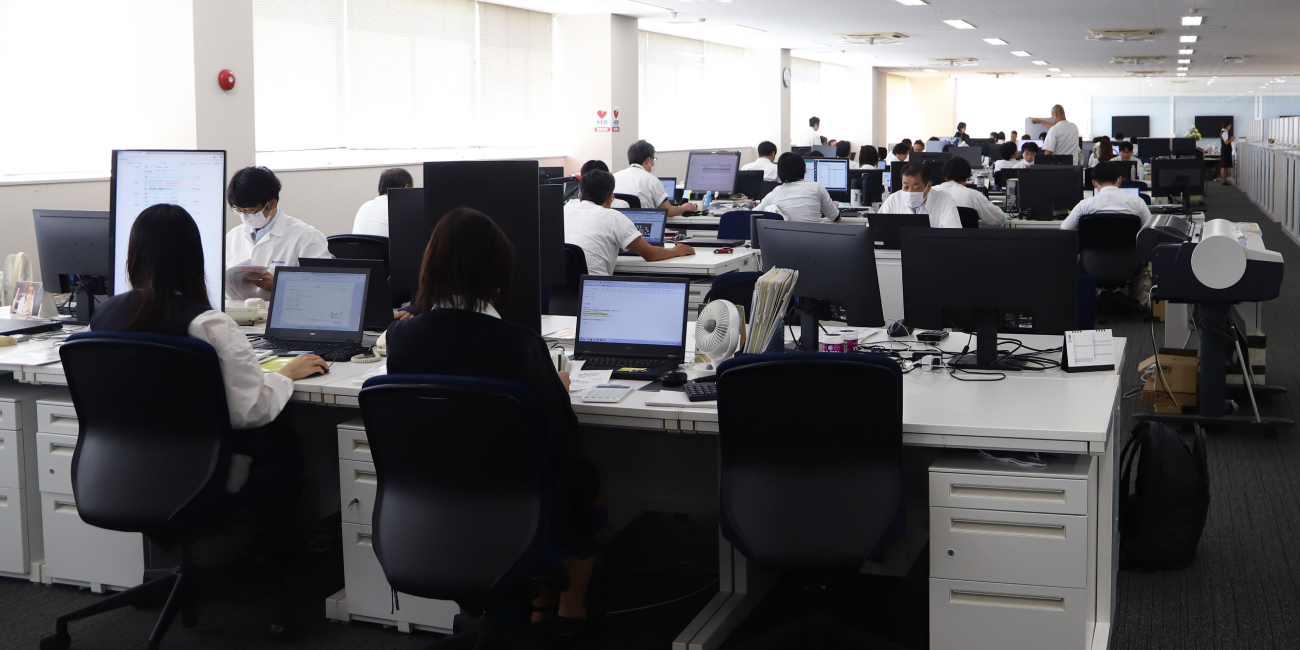 窓から光が差し込む明るいオフィスでは、技術部や営業購買部・人事総務部など管理部門が日々の業務に取り組んでいます。集中しやすいレイアウトながら、必要なときにはすぐに相談し合える距離感で、働きやすい雰囲気が広がっています。